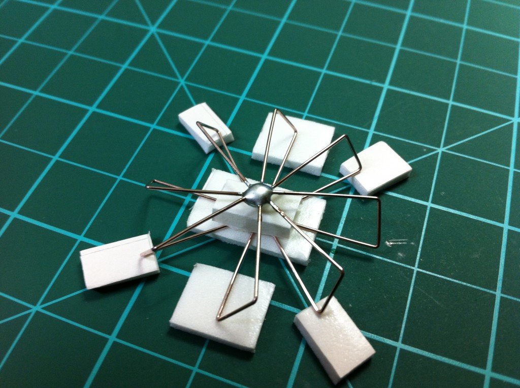 Use a template, such as the one depicted below, to properly align the blades 45 degrees apart. Use double sided foam tape or another temporary adhesive to hold the blades in place. A piece of scrap below the top wires will help to prevent the solder from melting to the lower wires.