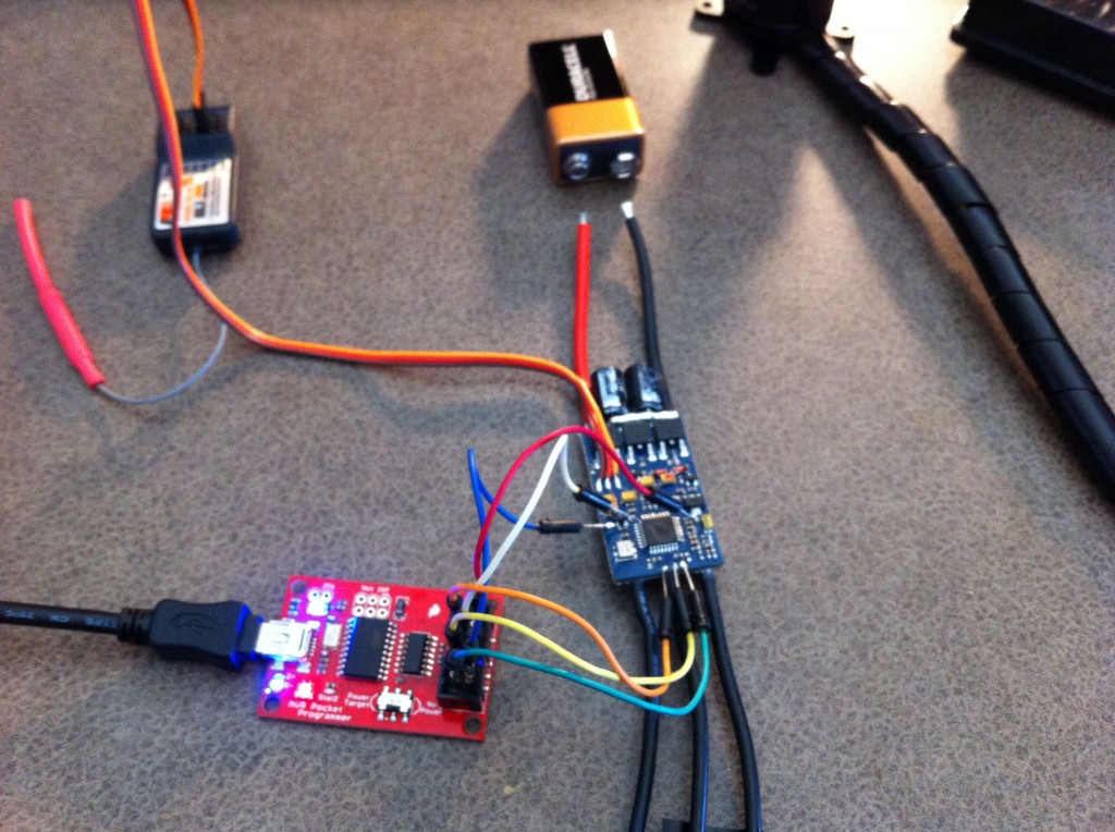 The procedure for flashing the speed controllers is fairly easy, the process of flashing the speed controllers takes about two seconds. In order to prevent the speed controllers from being damaged in the event that the flashing has failed, power your system from a 9 volt battery. This will prevent excessive current from damaging the speed controllers.