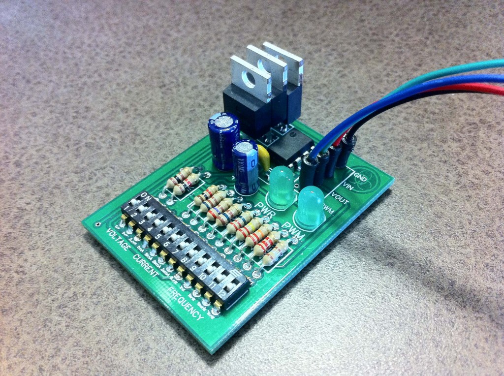 This is a miniature power supply which accepts voltage inputs between 12 and 18 volts. It uses a 12 position dip switch to program the output of the power supply. The power supply can output 12v, 5v, and 3.3v. At 5v the power supply is switchable between 5mA, 10mA, 20mA, 30mA and it can also output a square wave signal of 0.1Hz, 1Hz, 10Hz, 100Hz, and 1kHz. The power supply is built with three voltage regulators and a 555 timer. It includes two LEDs indicating power output and frequency.